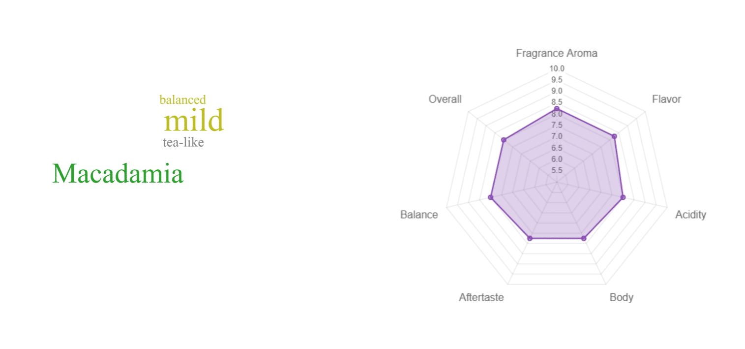 Cup Profile: Aroma of macadamia and strawberry, mild acidity. Flavours of strawberry, vanilla, macadamia and cream. A light body and a gentle aftertaste.